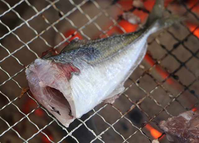 魚釣りで釣った魚を自分でさばき、塩焼きにして食べることができます。